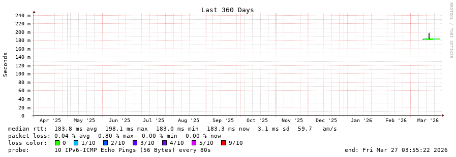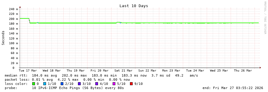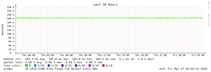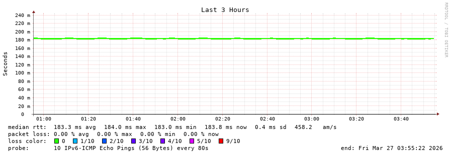18 > 2604:2dc0:30c::2:0:4e (2604:2dc0:30c::2:0:4e) [*] 183.631ms 183.582ms 183.526ms